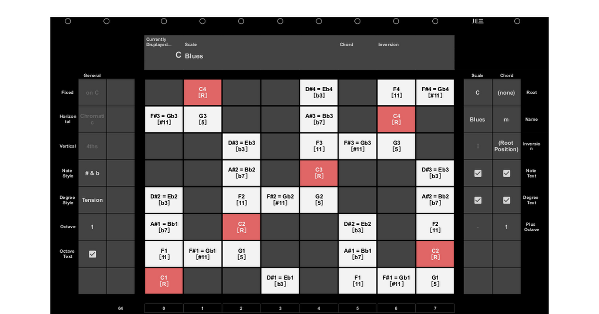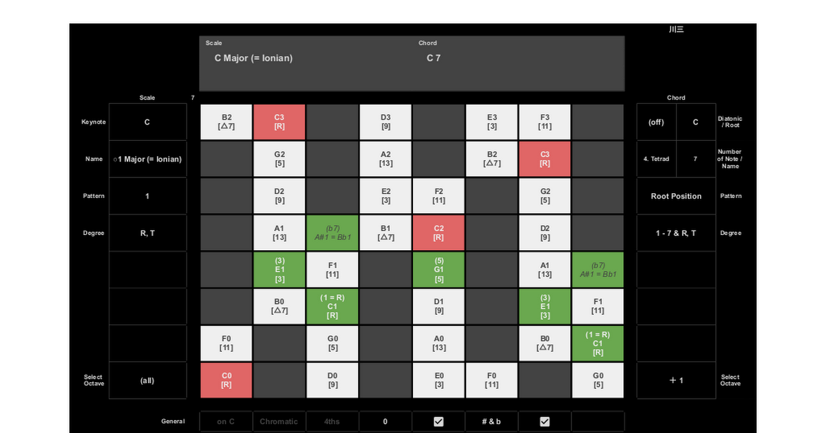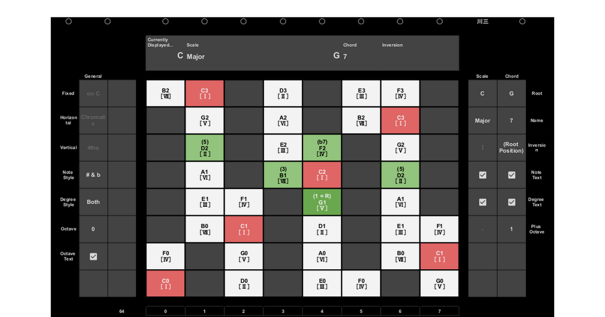 - Ⅰ – Ⅶ(ローマ数字での1〜7度表記。7音スケール選択時のみ、選択可能になる)